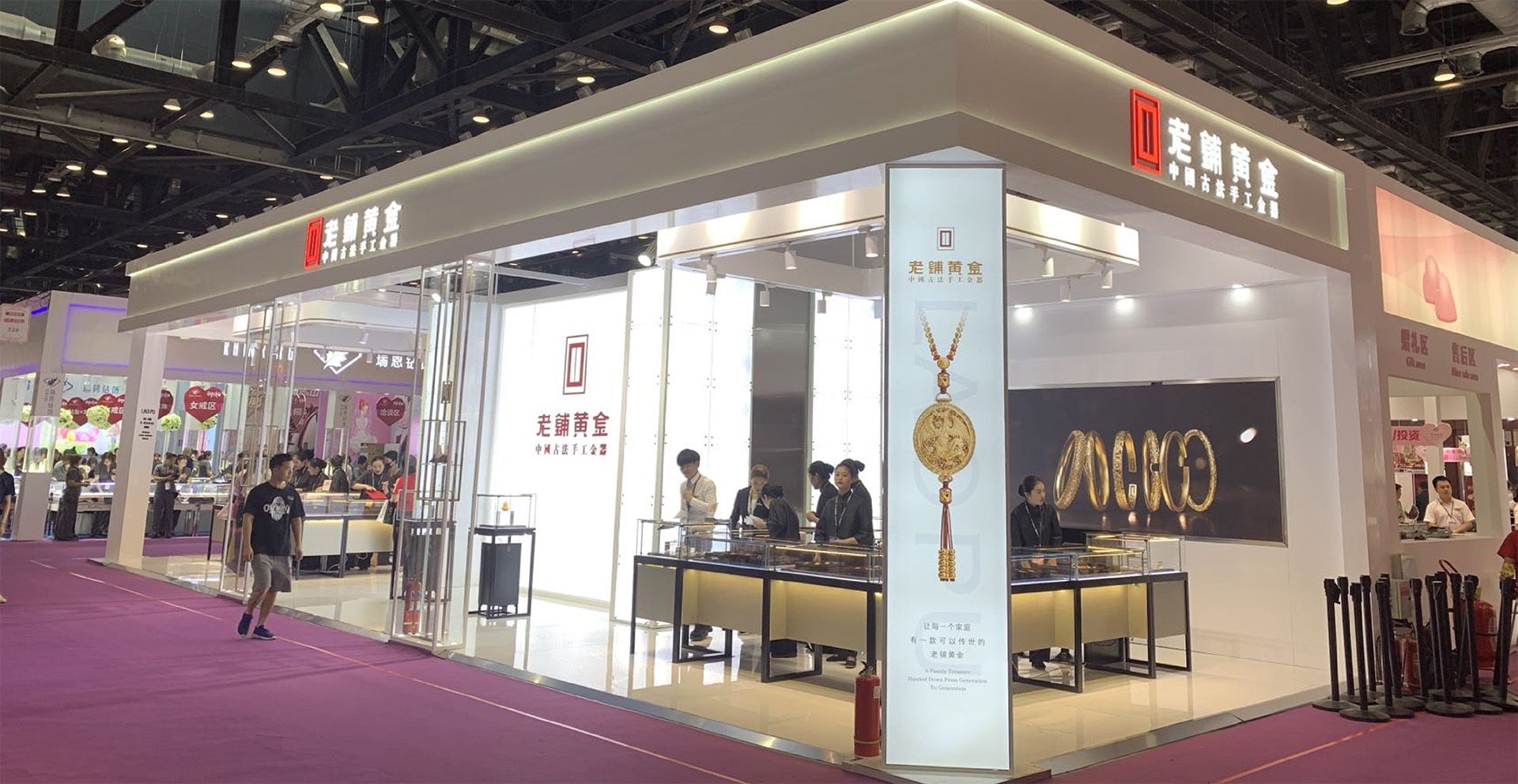 2019年6月和8月,老铺黄金展台设计布展,老铺黄金是中国古法黄金高端品牌,恪守纯正古法工艺,融会国际时尚美学。
